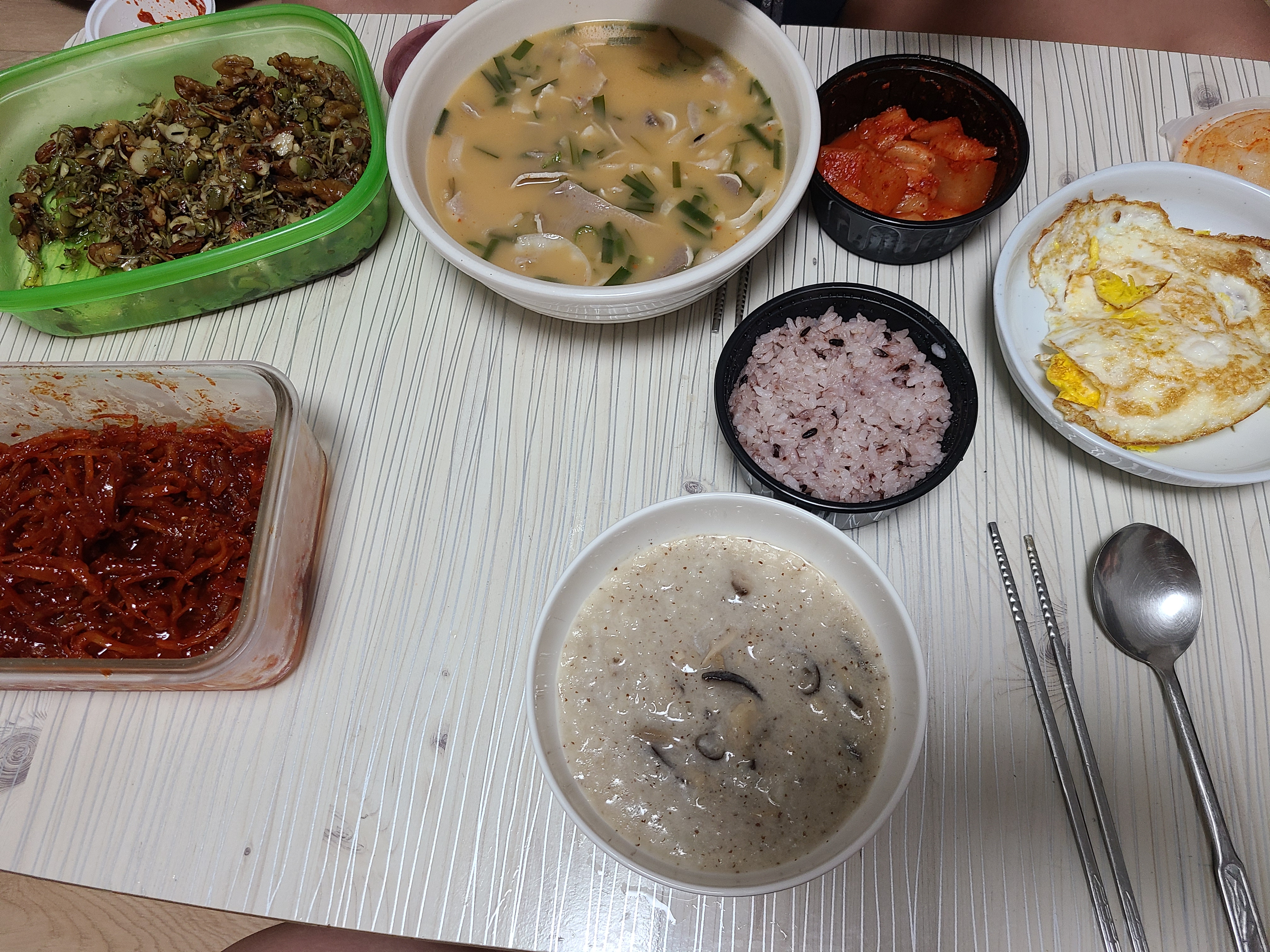 저녁 : 비비고 버섯죽 1/2+멸치볶음+진미채+계란후라이 1/3+돼지국밥 국물 2숟갈
