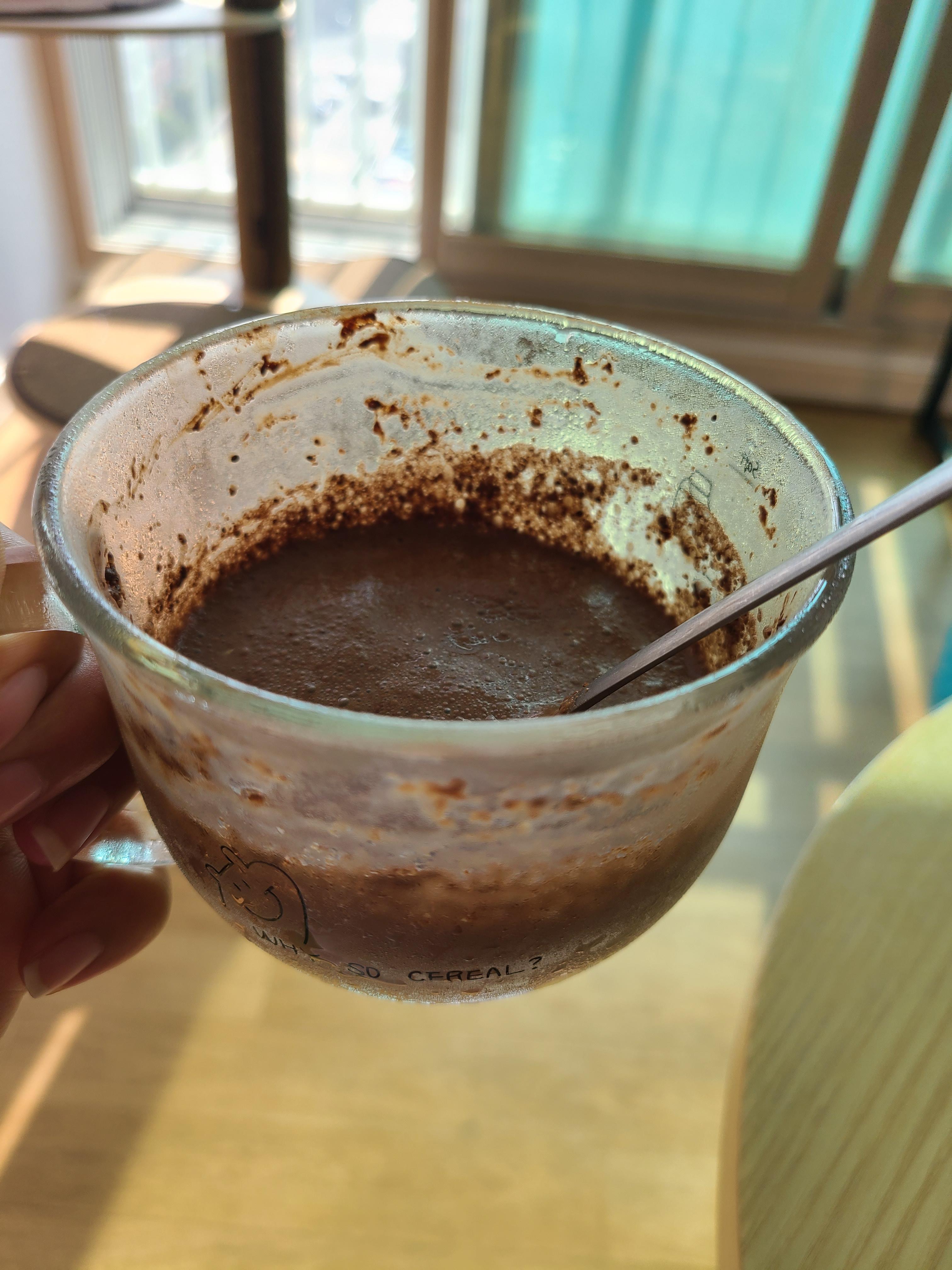 허쉬무가당코코아가루2숟갈, 아몬드 브리즈 오리지날 150ml정도.