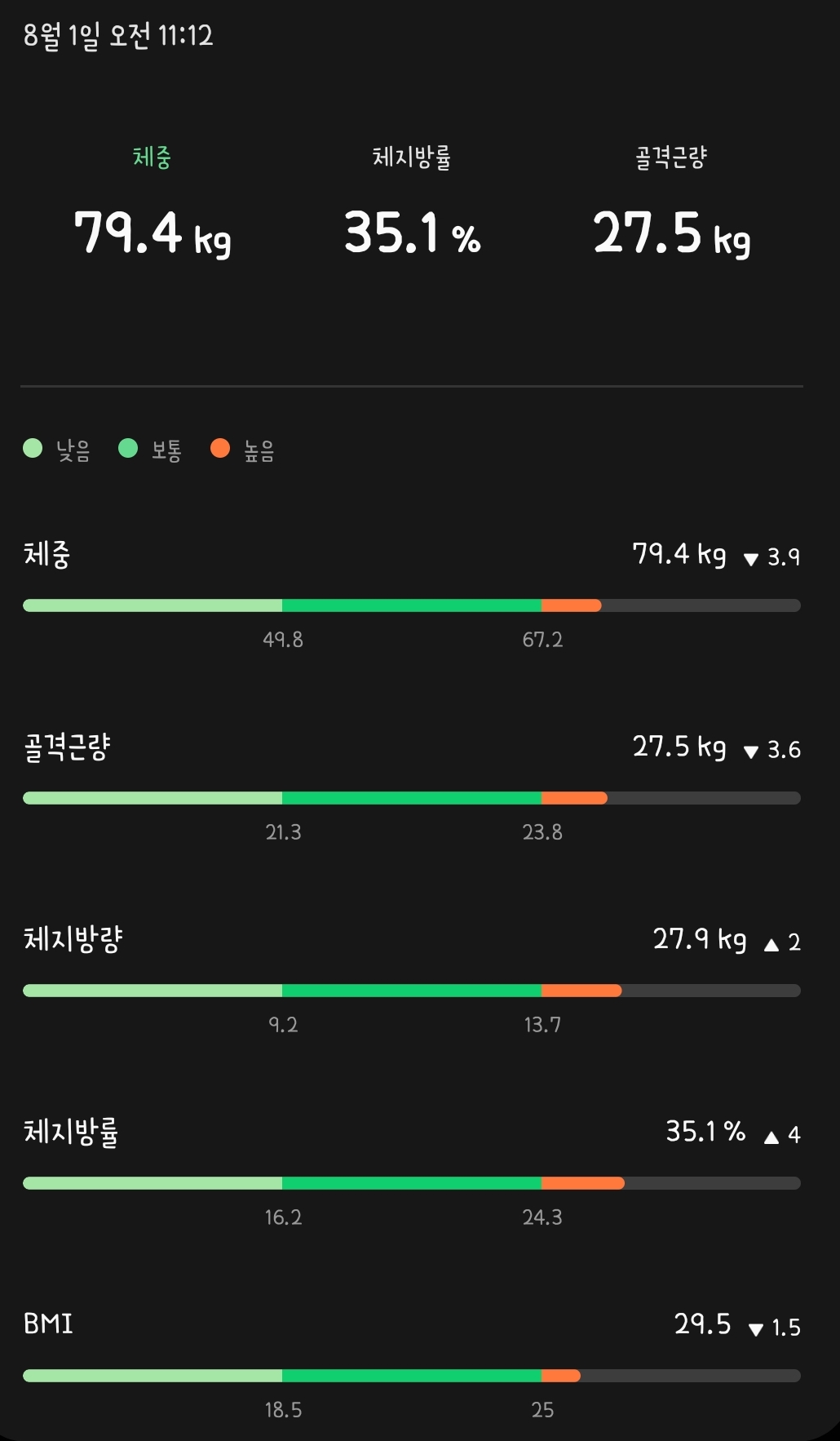 | 체지방량 (kg) | 27.9 | 25.2 | -2.6 |