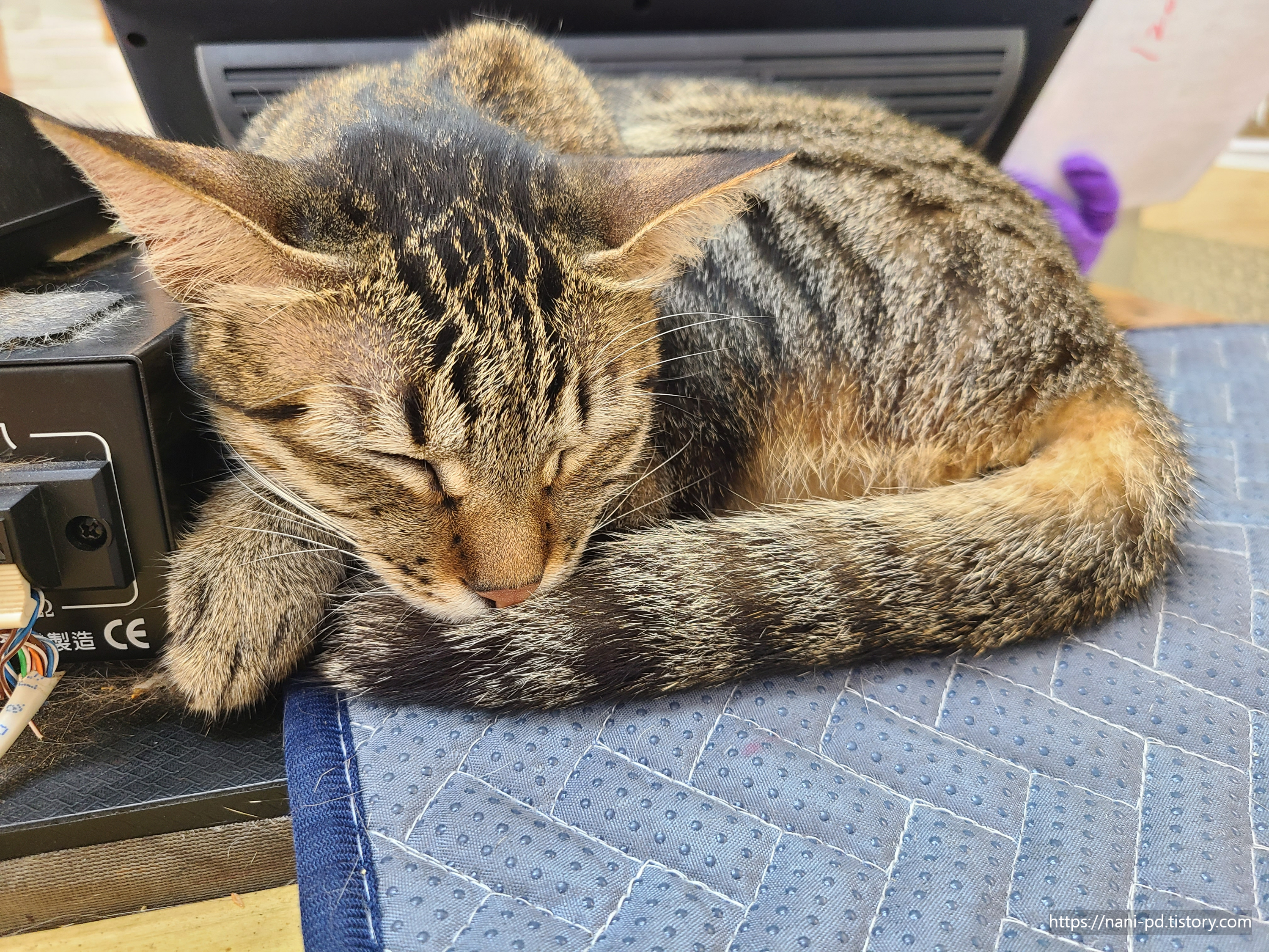 카운터 앞에 진짜로 고양이가 자고 있어요.